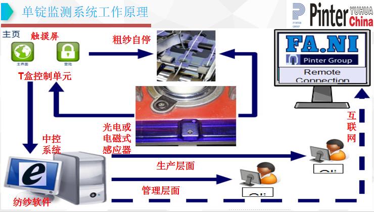 單錠監(jiān)測系統(tǒng),包含錠子監(jiān)測模塊、粗紗自停裝置、能耗模塊、牽伸模塊、效率模塊、照明控制模塊、T盒控制單元、中控系統(tǒng)等,其中每個模塊都包含監(jiān)測單元、執(zhí)行或顯示單元,用戶可根據(jù)需求選擇。尤里卡紡紗軟件,通過主服務(wù)器,收集、記錄各個子系統(tǒng)的實時數(shù)據(jù),并將數(shù)據(jù)進行整理和分析后,分別提供給管理人員、操作人員和維護人員等。